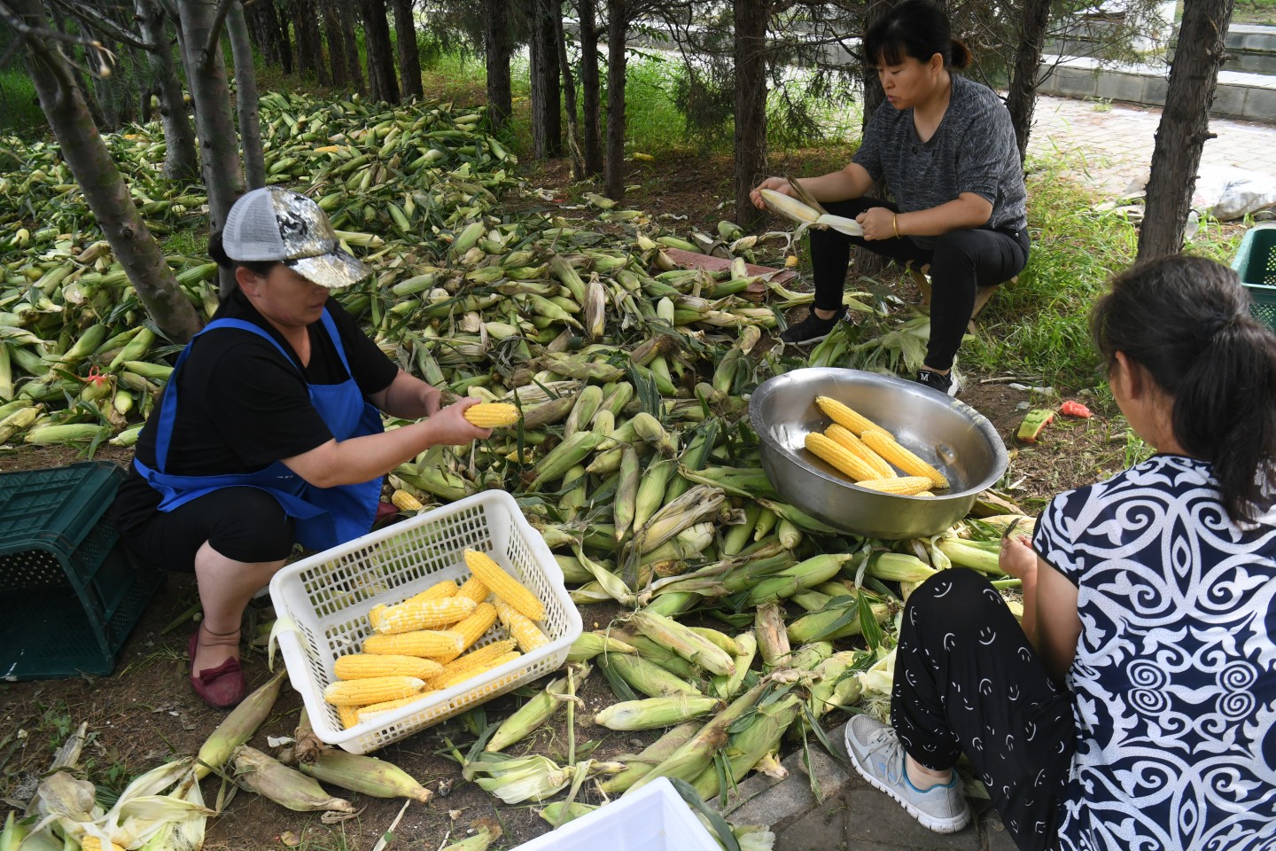 安置点里的村民在包玉米。新京报记者 王颖 摄