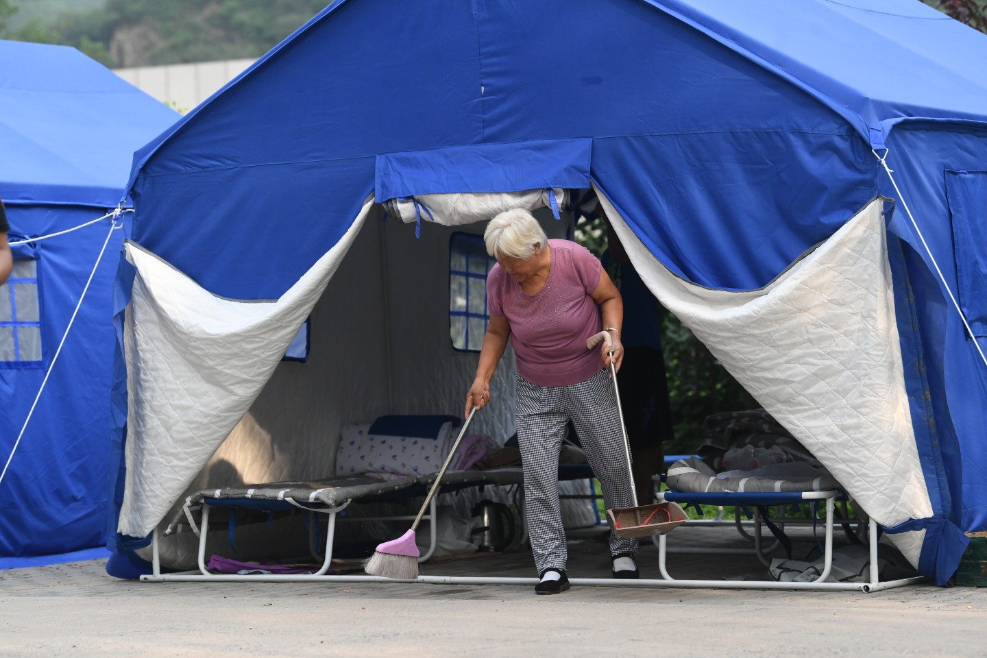 住在安置点的村民打扫帐篷卫生。新京报记者 王颖 摄