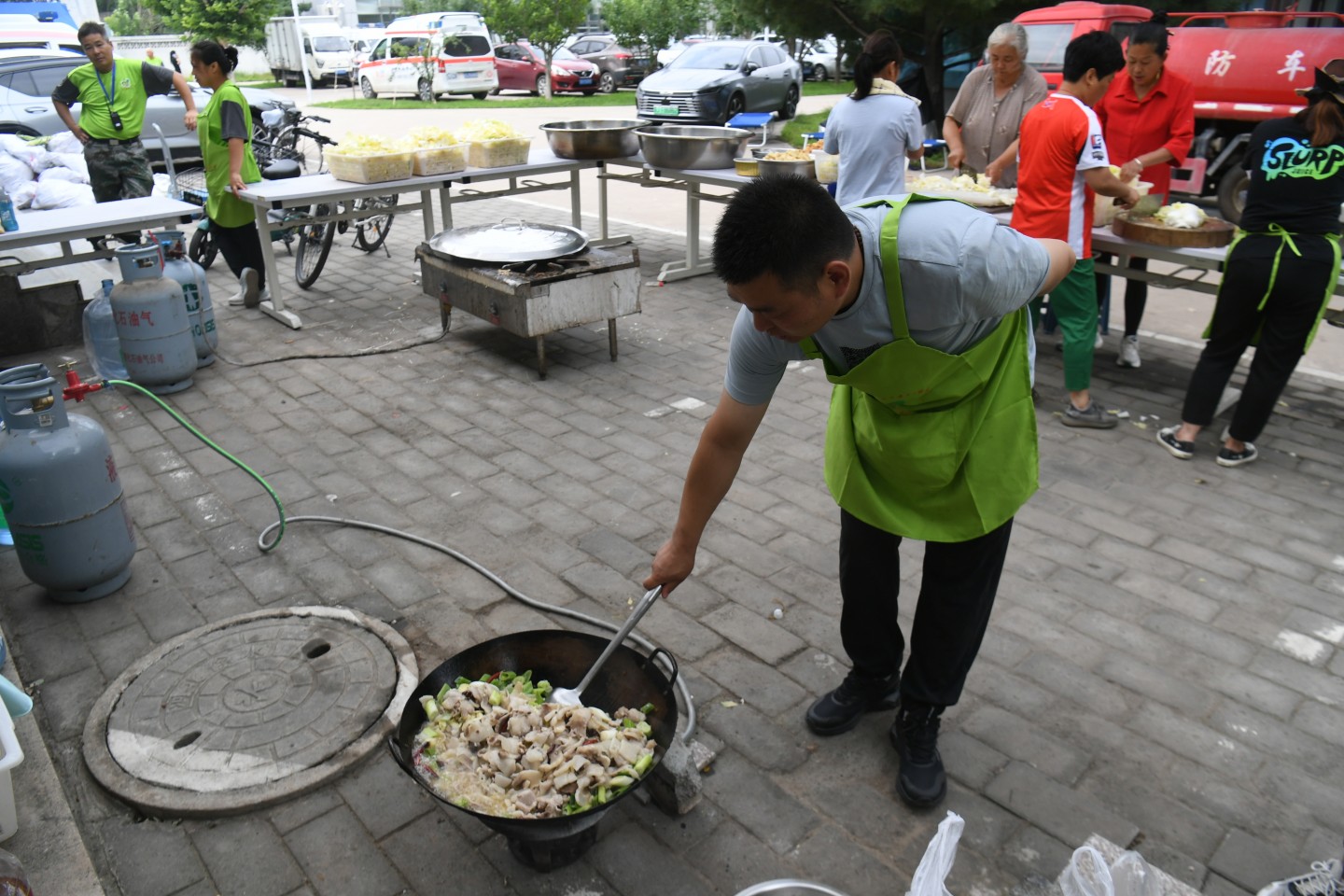 相同境遇的还有不少,院子一侧的临时厨房中,每天至少要做上百人的饭,许多周边的村民来帮忙做饭。他们垒起临时的灶台,大锅炒菜,大笼蒸馒头,开饭的时候,香味传出很远。