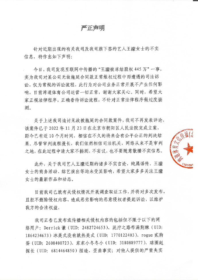 此前,湾道体育文化传播(北京)有限公司还就签约艺人王濛的不实信息发表声明,表示“王濛被冻结股权445万”一事实为公司对某公司无故拖延合同款正常维权过程中而遭遇的司法诉讼,仅为常规的诉讼流程,此行为对公司业务正常开展不产生任何影响,目前湾道体育公司运营一切正常。同时,希望大家正视法律程序,正确看待诉讼流程,不针对正常法律程序做过度揣测。