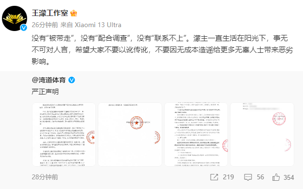 王濛工作室:王濛没有“被带走”,没有“配合调查”