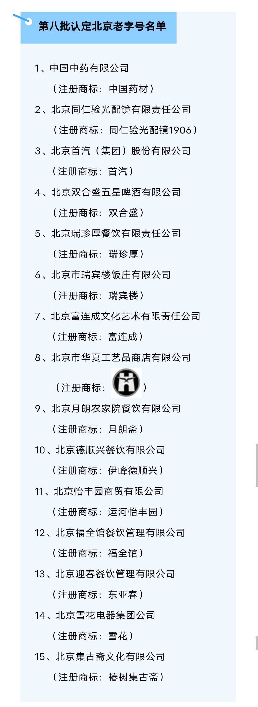 新京报讯(记者陈琳)8月10日,北京老字号协会发布《关于第八批北京老字号企业认定结果的通知》,中国中药有限公司等15家企业(15个品牌)被认定为北京老字号。截至目前,已先后认定8批,共238家北京老字号企业。