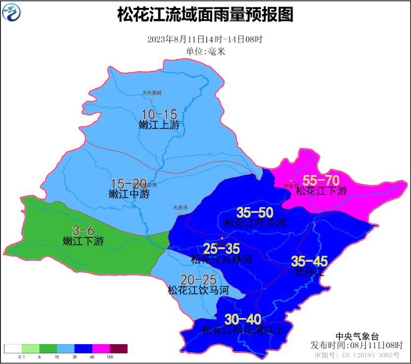 松花江流域面雨量预报:11日下午至13日,松花江流域中东部面雨量20~55毫米,其中松花江下游面雨量55~70毫米;鸭绿江、图们江、绥芬河子流域面雨量40~45毫米。