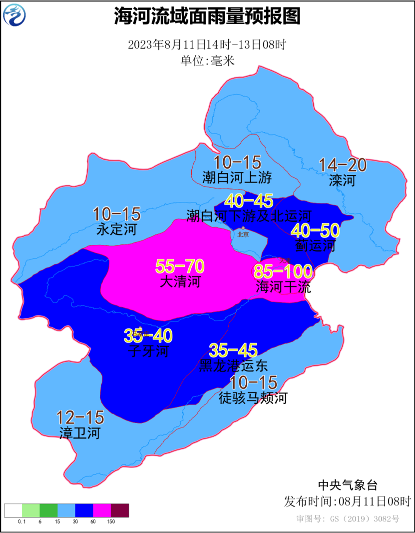海河流域面雨量预报:11日下午至12日,海河流域中部子流域面雨量35~50毫米,其中大清河面雨量55~70毫米、海河干流85~100毫米。