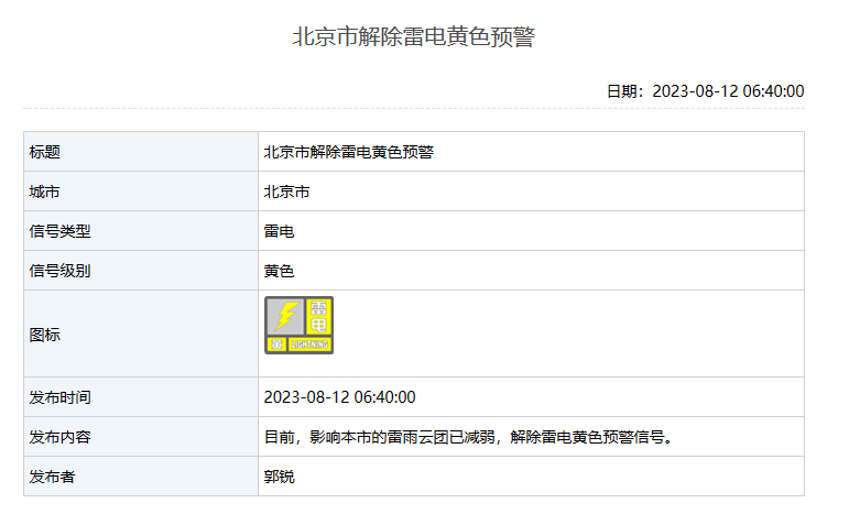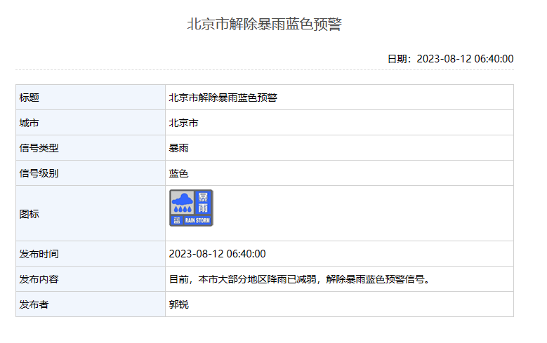 新京报讯 据北京市气象局消息,目前,本市大部分地区降雨已减弱,解除暴雨蓝色预警信号。影响本市的雷雨云团已减弱,解除雷电黄色预警信号。