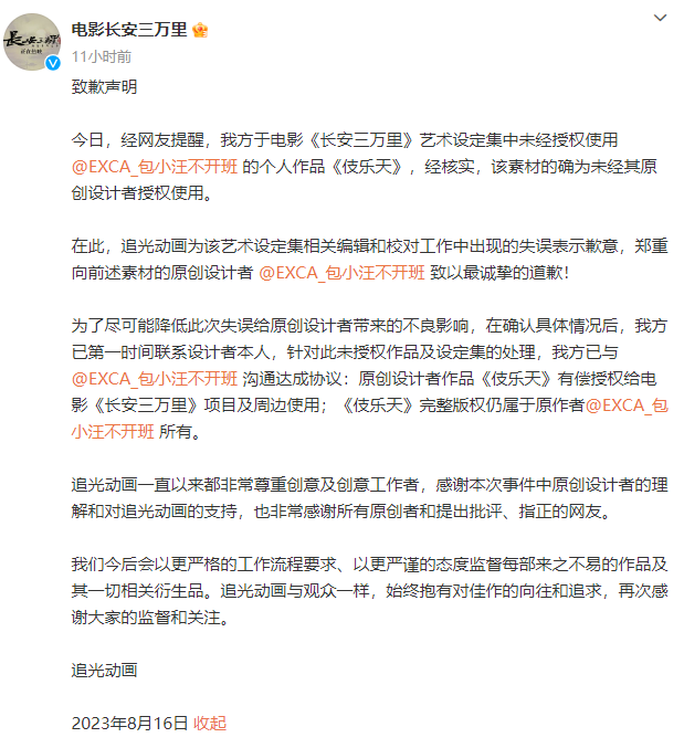 今日,经网友提醒,我方于电影《长安三万里》艺术设定集中未经授权使用@EXCA_包小汪不开班 的个人作品《伎乐天》,经核实,该素材的确为未经其原创设计者授权使用。