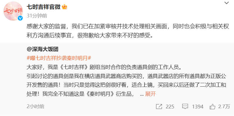 《七时吉祥》剧方回应涉嫌抄袭:已加紧审核,并技术处理相关画面