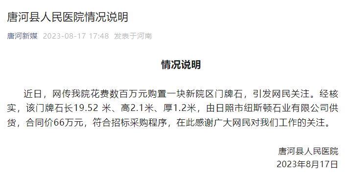新京报讯 据唐河新媒微信公众号消息,近日,网传唐河县人民医院花费数百万元购置一块新院区门牌石,引发网民关注。经核实,该门牌石长19.52 米、高2.1米、厚1.2米,由日照市纽斯顿石业有限公司供货,合同价66万元,符合招标采购程序。