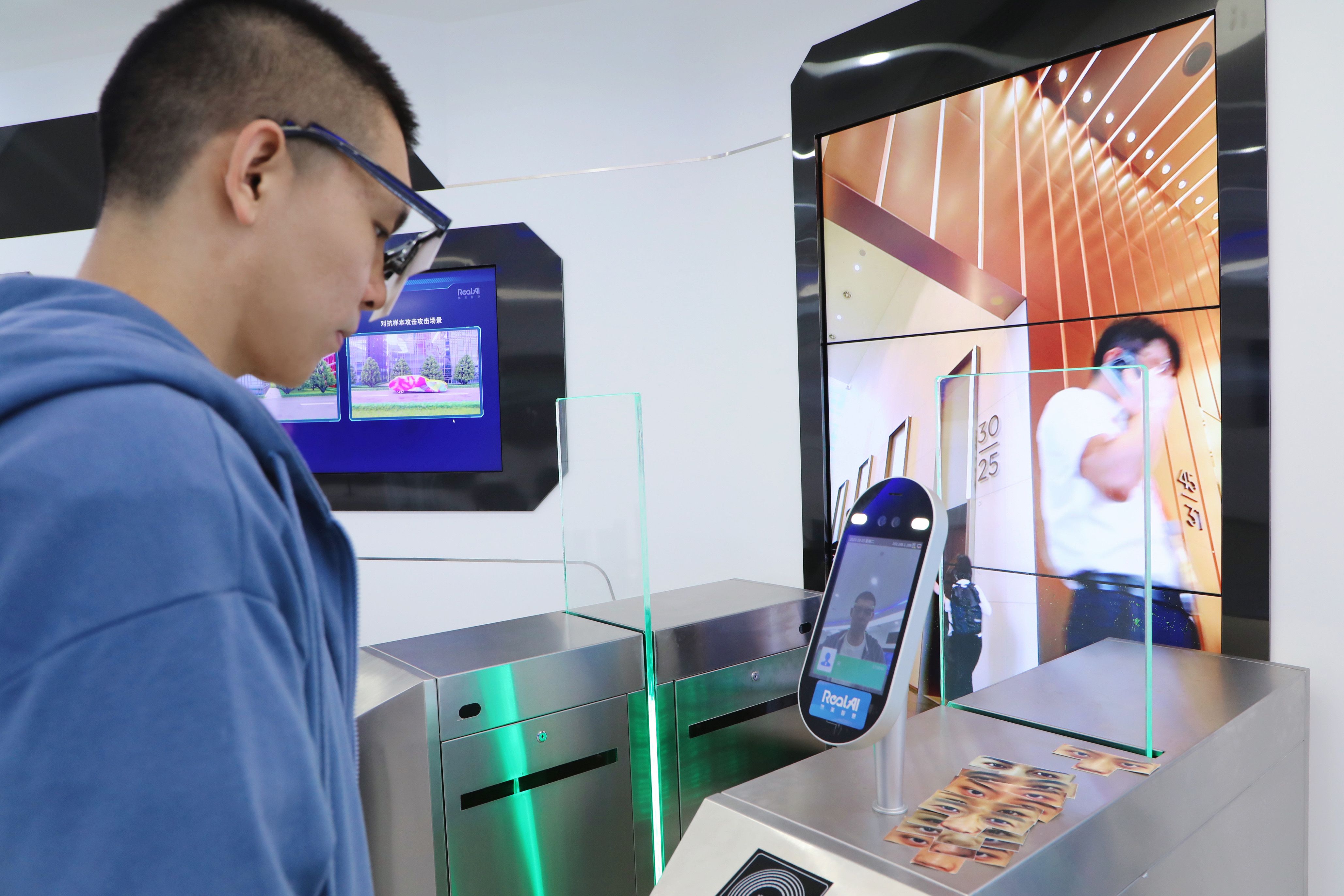 随着一声清脆的“滴答”,闸机屏幕显示出一位明星名字,门也随之打开。不过,真正进入闸机的却是头戴人工智能对抗眼镜的工作人员。
