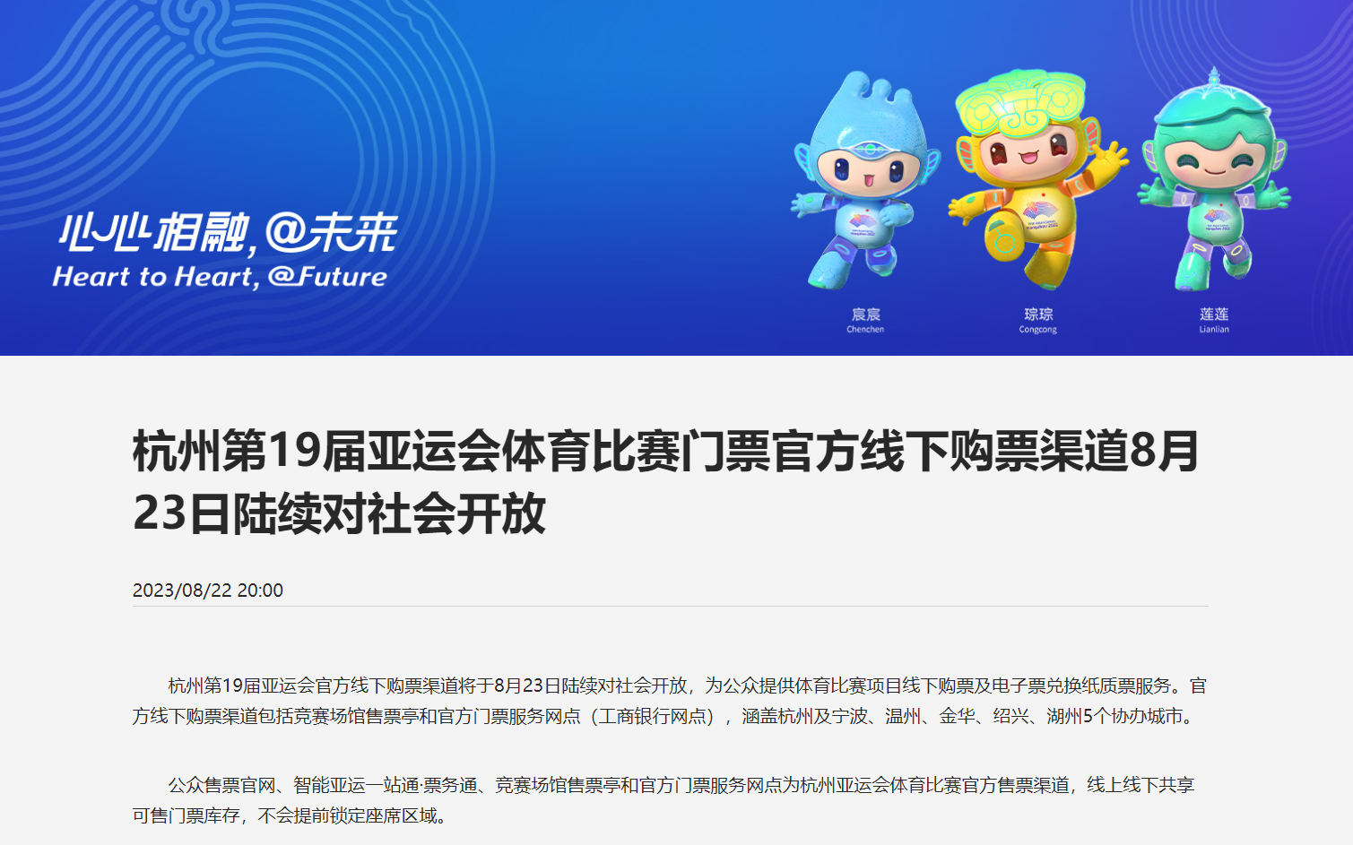 杭州亚组委表示,公众售票官网、智能亚运一站通·票务通、竞赛场馆售票亭和官方门票服务网点为杭州亚运会体育比赛官方售票渠道,线上线下共享可售门票库存,不会提前锁定座席区域。