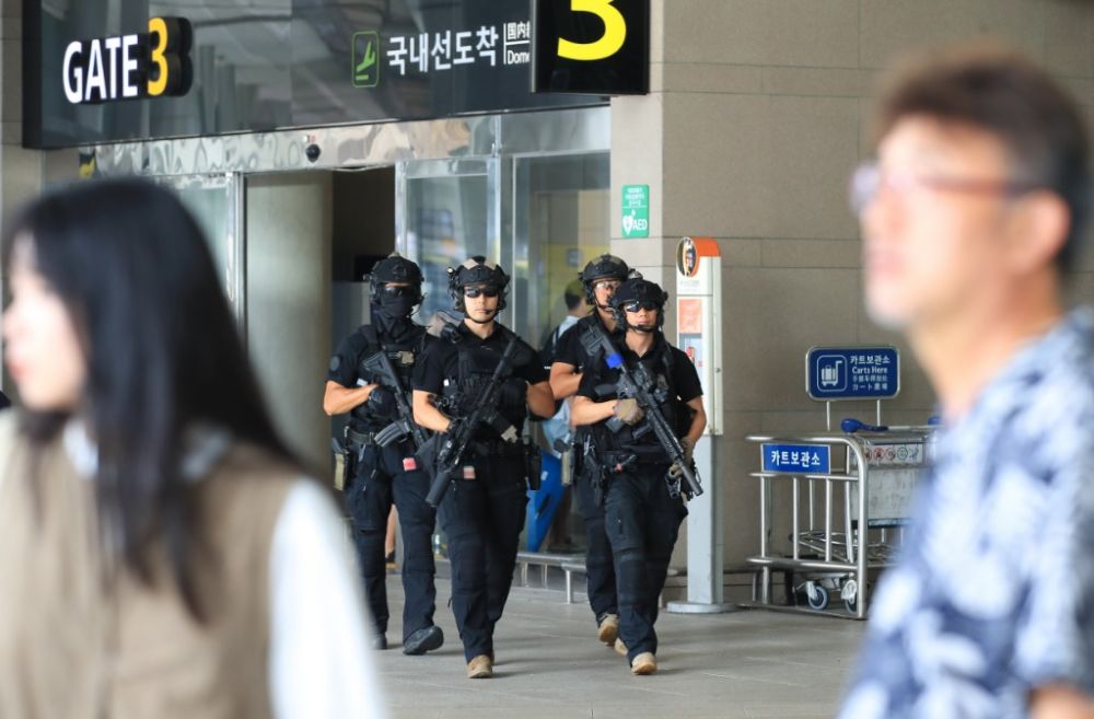 8月6日,全副武装的特警在韩国济州国际机场巡逻。新华社/纽西斯通讯社