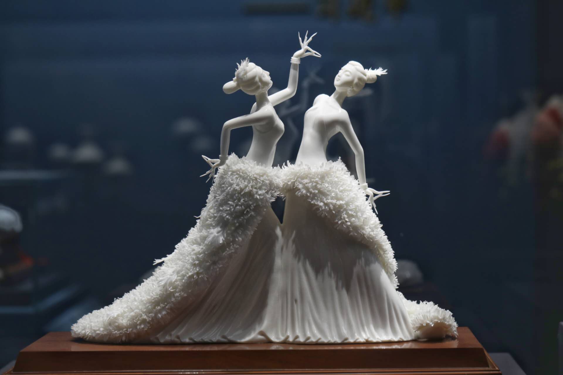 记者看到,现场不仅有茶具、餐具等实用器具,还有以李白、老子、孔子等古代人物及嫦娥、荷花仙子等神话传说人物为题材的瓷塑人物作品。展览还展出了目前世界上最薄的陶瓷杯子“蝉羽杯”,该杯子的制作者为陈清宜,用优质高岭土等经过精心调配,胎体烧制过程中减少变形、坍塌、起泡,2019年起保持世界纪录至今。“和谐茶具”则是2018年中朝两国领导人在大连会晤指定专用茶具,其瓷质“似玉非玉,润泽如脂”。