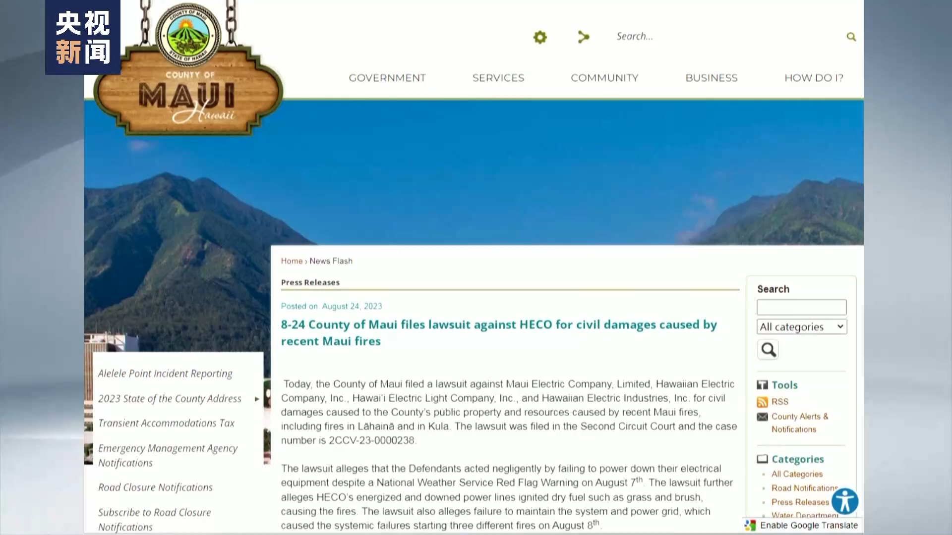 与此同时,毛伊县政府24日起诉夏威夷电力公司,认为毛伊岛大火是由夏威夷电力公司的“疏忽”而导致的人为灾难。起诉书称,夏威夷电力公司已接到相关气象警告,根据当地的天气情况应该及时切断电源,而正是该公司的过失,才导致被大风刮倒的电线引发了大火。毛伊县政府要求夏威夷电力公司就火灾造成的财产损失作出赔偿。夏威夷电力公司方面则表示,毛伊岛上没有正式的电力切断方案,称对毛伊县政府在火灾原因尚未调查清楚前就采取诉讼手段感到失望。