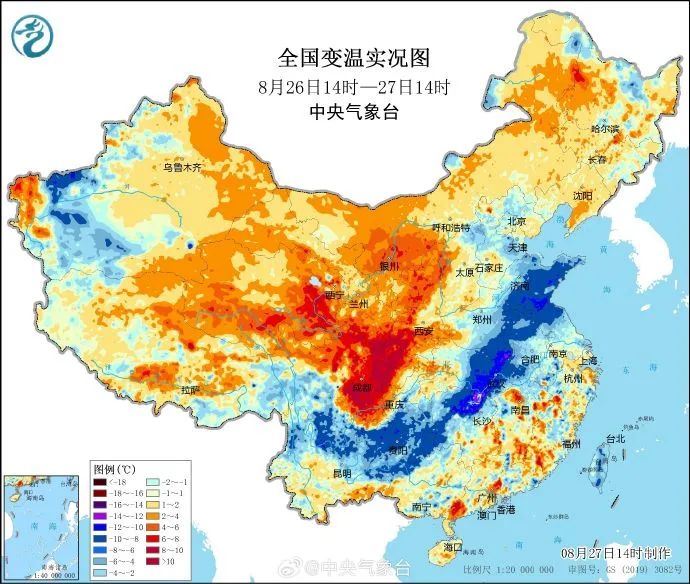 今天,贵州至山东普遍出现降温。图:中央气象台