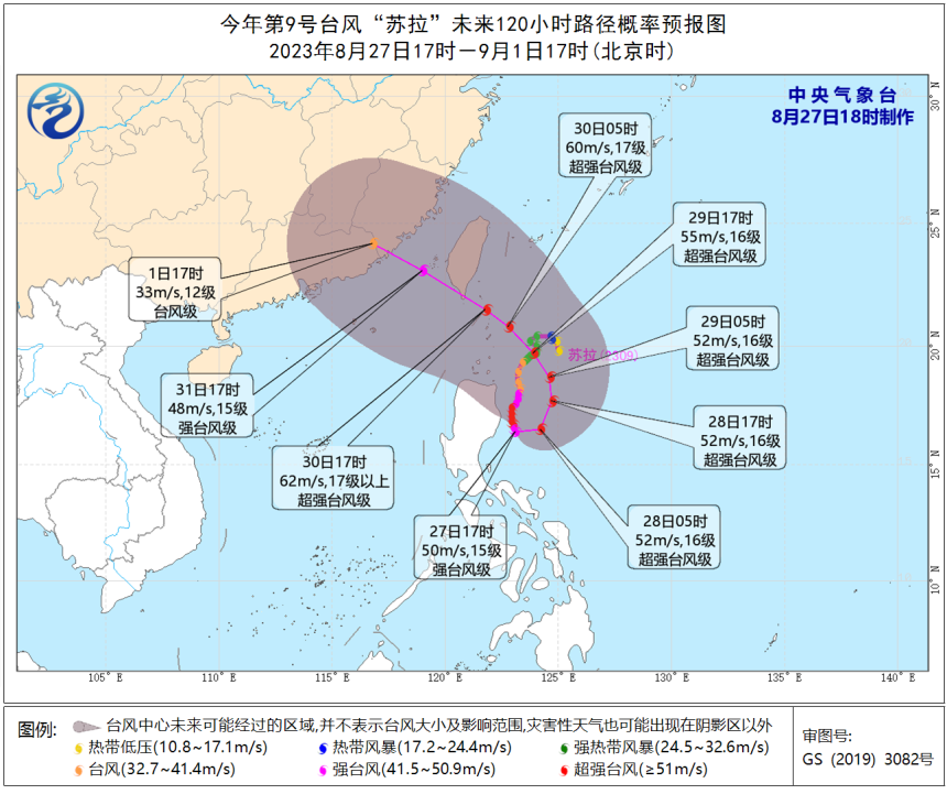 “苏拉”靠近台湾岛及以后的路径仍存在一定不确定性。不过基本确定的是,8月30日至9月1日,“苏拉”将影响台湾以东洋面、南海东北部海域、台风海峡、东海南部海域,福建、浙江沿海等地将有较强降雨,上述地区公众要做好防范。