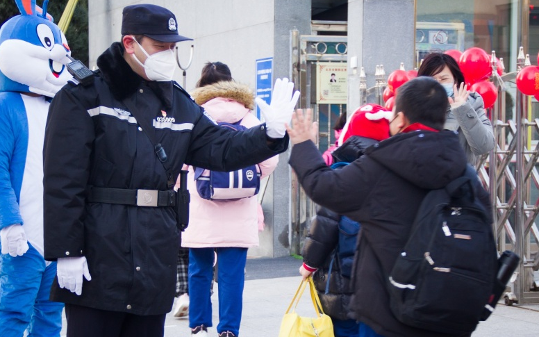 ▲2023年2月13日上午,在民警的护送和家长的陪伴下,学生们进入校园。新京报资料图
