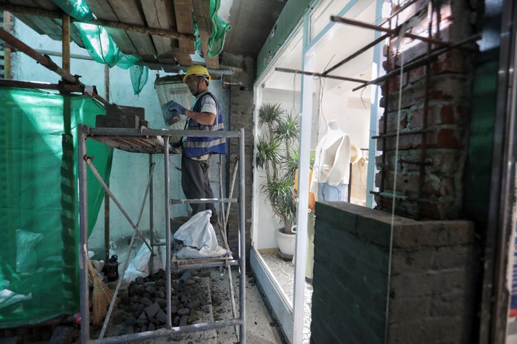 西单北大街,工人通过砌砖对沿街商铺外观进行优化。“西四-灵境胡同段”环境整治提升成果将于今年底前亮相。