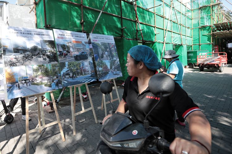 西四南大街,路边设置了改造工作的示意图,吸引了附近的居民和商户观看。此次改造通过建筑风貌整体提升、公共绿化空间提升、交通综合治理等,实现历史文化街区民生改善与活力复兴,是西城区全面落实北京城市新总规和核心区控规要求、探索老城城市更新的又一重要举措。