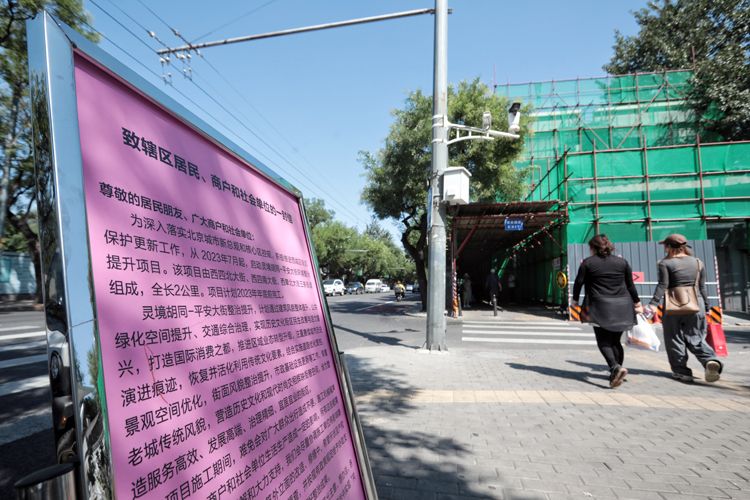 8月30日,西单北大街,路边设置了环境整治提升告示,不远处已经搭起脚手架。日前,西城区正式启动“灵境胡同-平安大街段”环境整治提升项目,主要开展建筑立面、第五立面整治提升、电箱“三化”、多杆合一、市政道路优化和消隐。整治提升项目坚持‘微整治、微修缮、微更新’的理念,挖掘历史印记,重塑老城风貌。