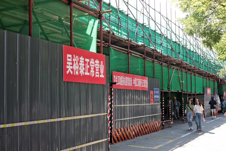 西单北大街,路边搭起的脚手架留出了进出空间,改造施工同时,商家仍可以正常营业。该项目将通过设置岛式公交站台、规范非机动车停放、提升人行道铺装品质、保障无障碍通行等措施,实现绿色交通骨干道路功能转型,构建绿色、安全、高效的交通体系。