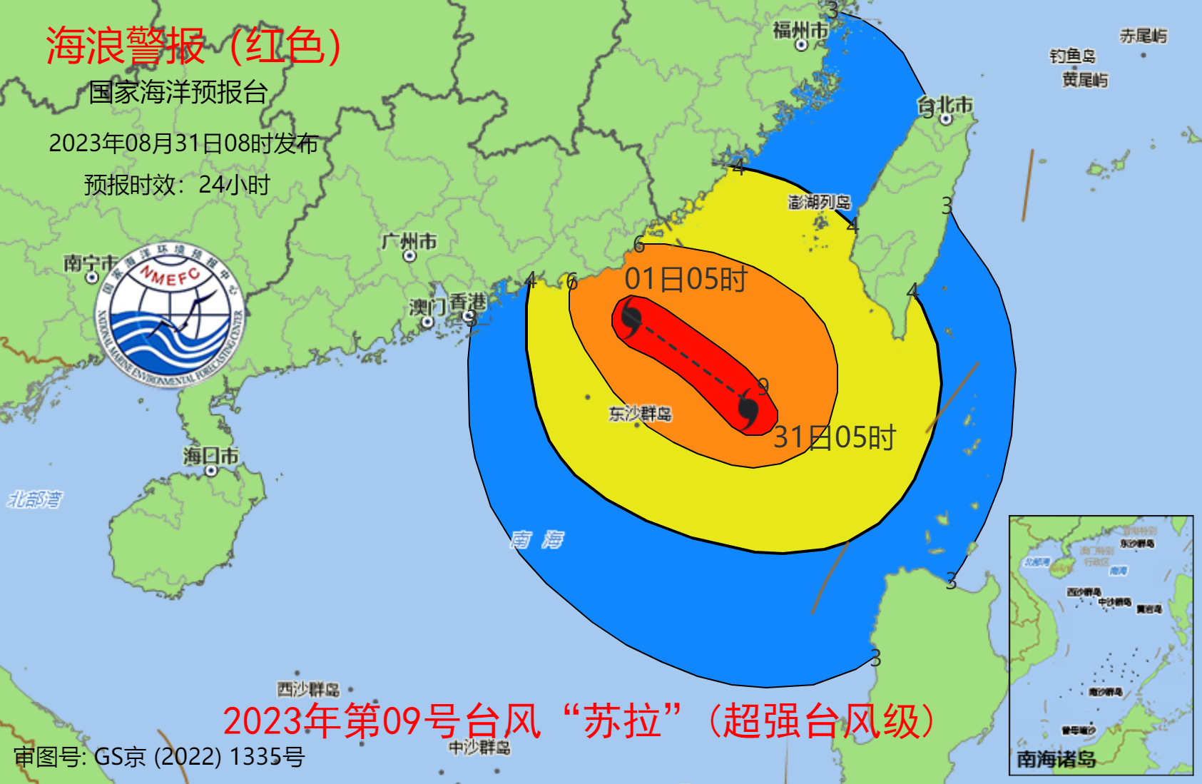 新京报讯(记者张建林)8月31日,记者从自然资源部获悉,超强台风“苏拉”已移入我国南海东北部海面,并逐渐靠近广东东部沿海,预计广东东部近岸海域将出现巨浪到狂浪,福建省厦门市、漳州市、广东省潮州市和汕头市沿海将出现较大风暴增水。