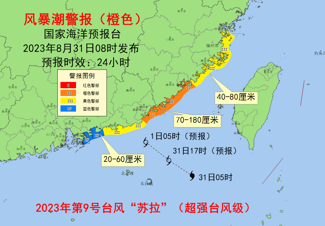 风暴潮方面,预计8月31日上午至9月1日中午,福建福州至泉州沿海将出现40到80厘米的风暴增水,福建厦门至广东汕尾沿海将出现70到180厘米的风暴增水,广东惠州和深圳沿海将出现20到60厘米的风暴增水。福建省厦门市、漳州市、广东省潮州市和汕头市的风暴潮预警级别为橙色,福建省福州市、莆田市、泉州市、广东省揭阳市和汕尾市的风暴潮预警级别为黄色。