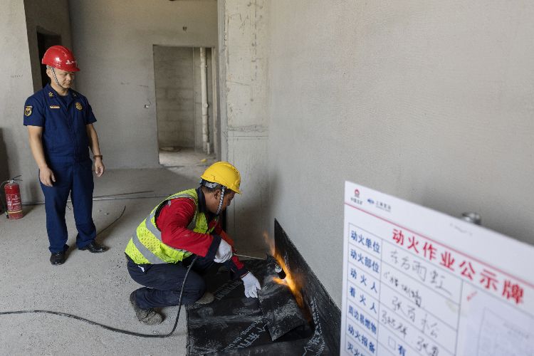 8月31日,北京市大兴区消防救援支队联合房山区消防救援支队在一处在建工地进行电焊、切割、防水作业的火灾实验,通过还原施工现场火灾,进行消防安全提示。图为工人演示防水施工。
