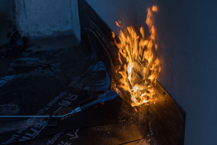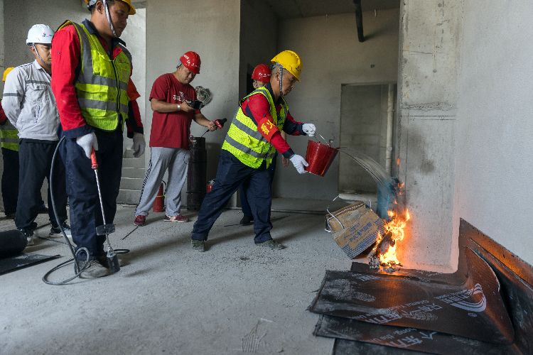 施工人员使用喷灯铺设防水卷材时引燃附近可燃物,使用消防水桶灭火。“在施工作业前,需要准备消防水桶和干粉灭火器,施工作业时,工作人员不得离开现场。”黄文红说。