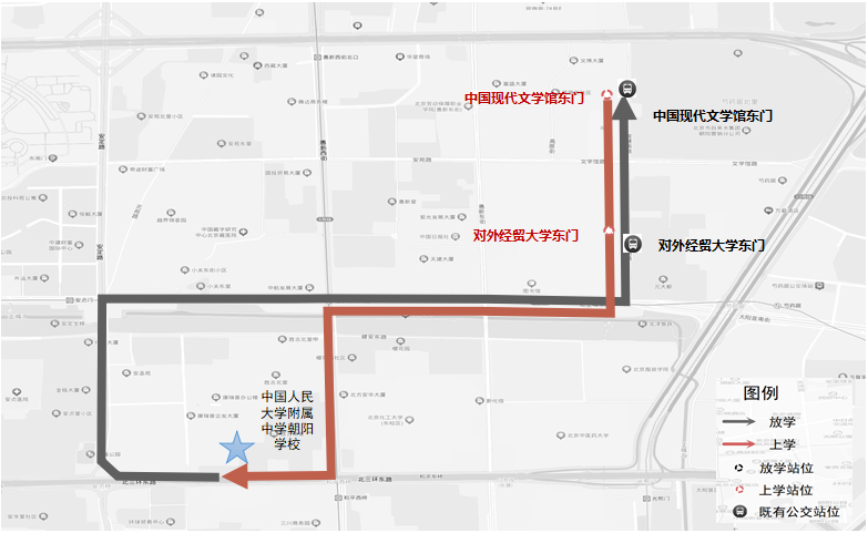 站点设置:中国现代文学馆东门站——对外经贸大学东门站——和平西桥站(学校端)