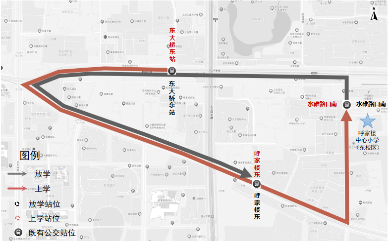 站点设置:东大桥东站——呼家楼东站——水碓路口南站(学校端)