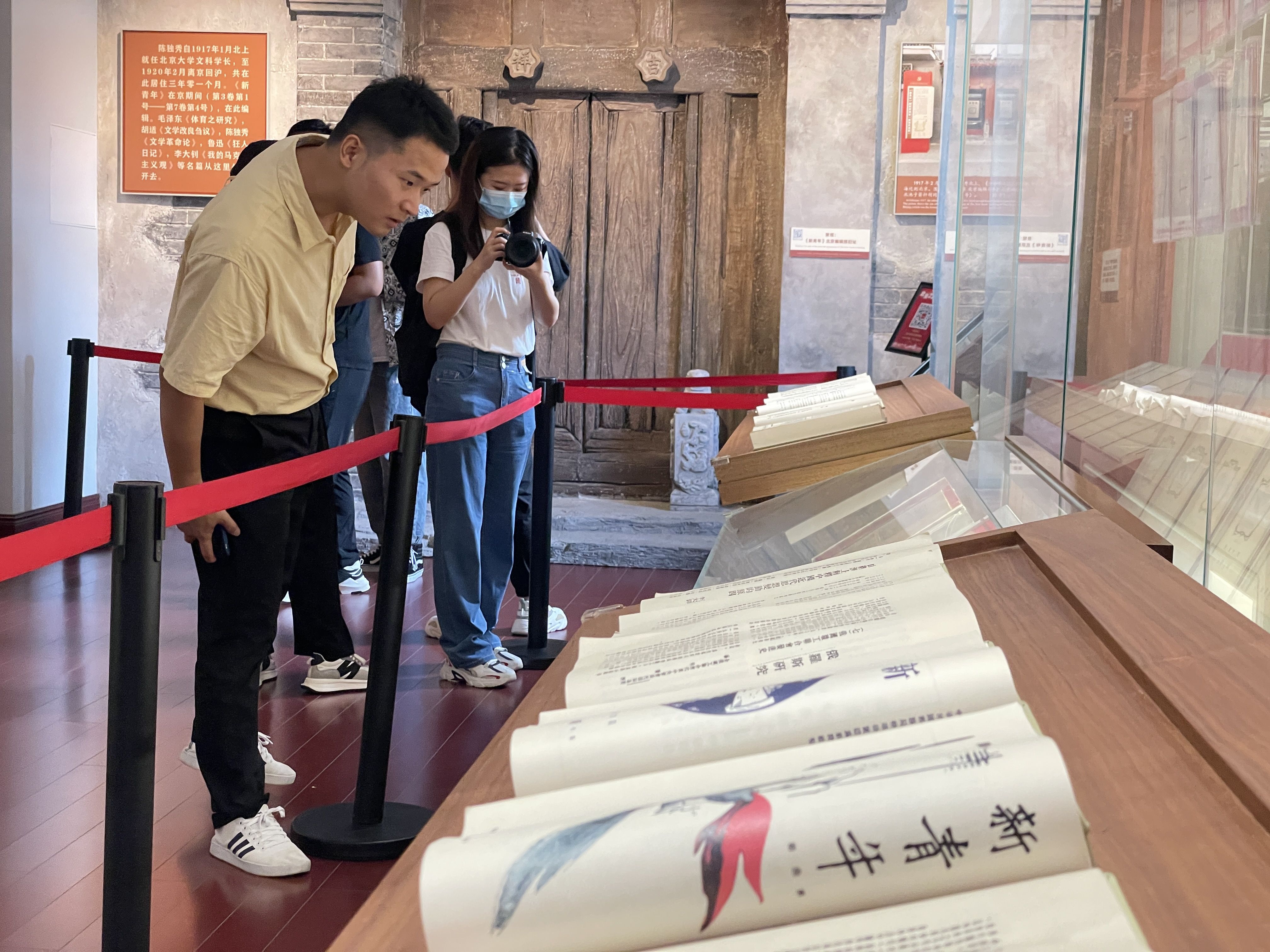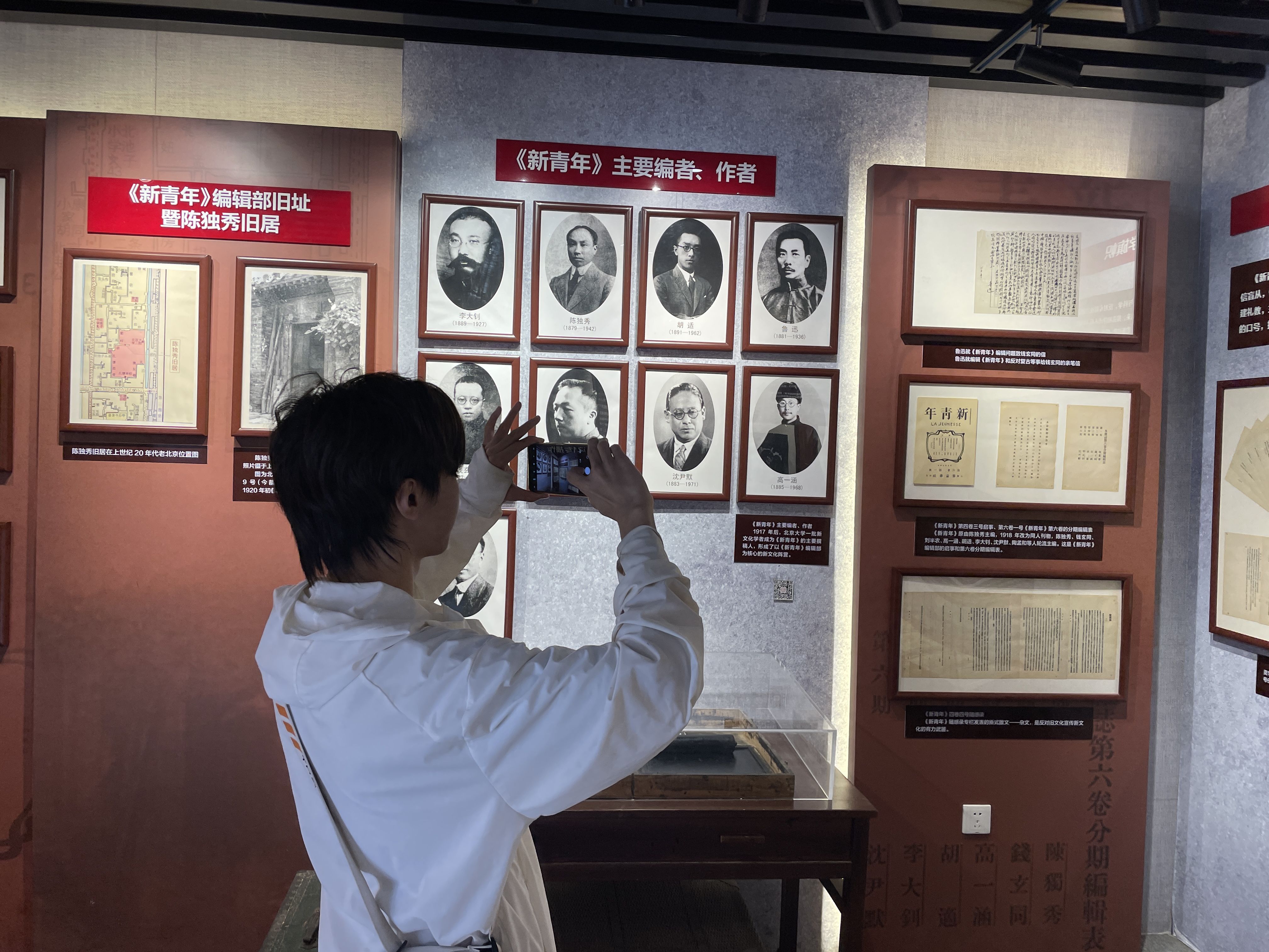 《新青年》编辑部旧址展厅内,市民参观展览并打卡拍照。新京报记者 耿子叶 摄