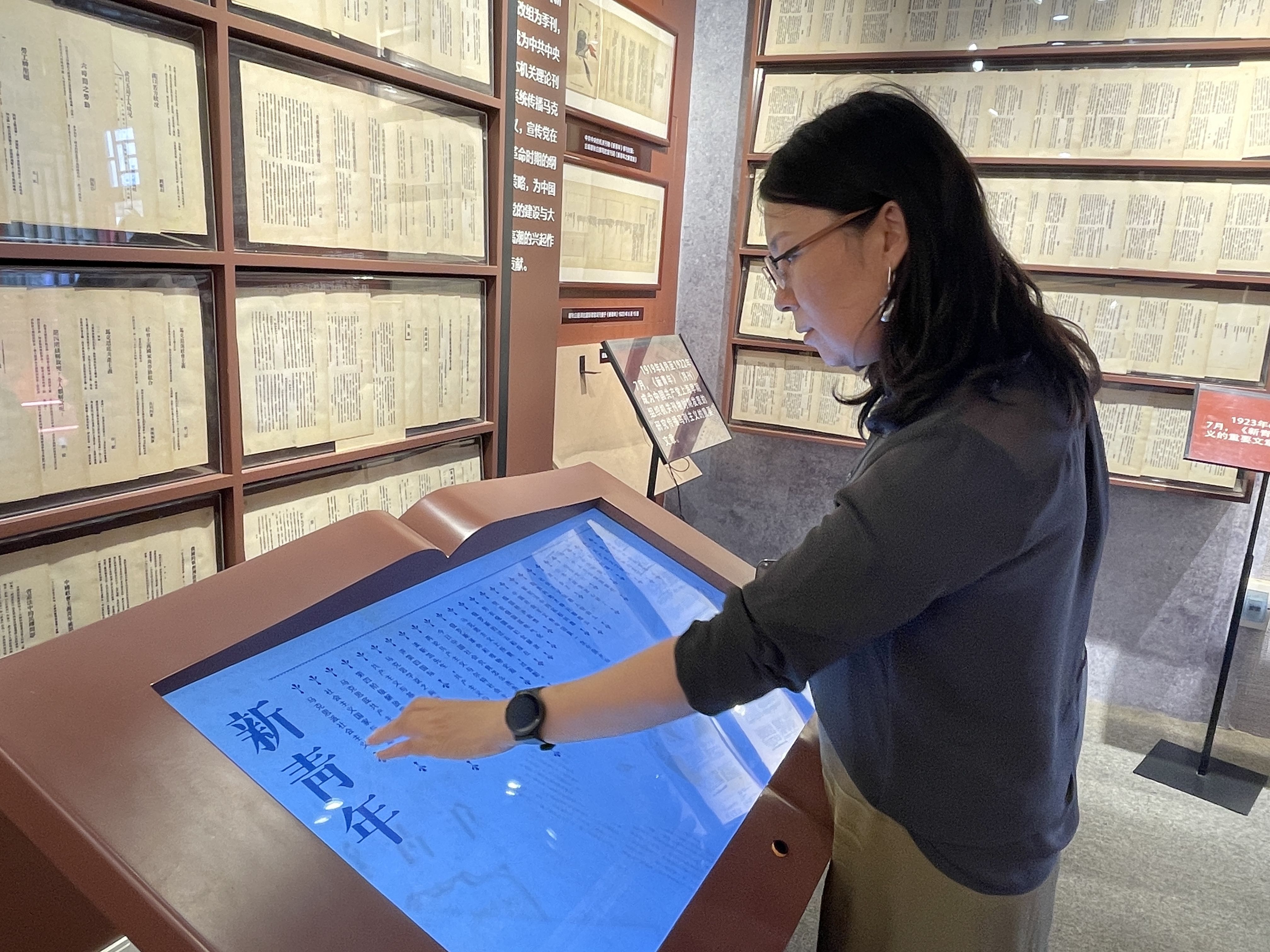 《新青年》编辑部旧址展厅内,参观者正在大屏幕上翻阅电子版《新青年》。新京报记者 耿子叶 摄