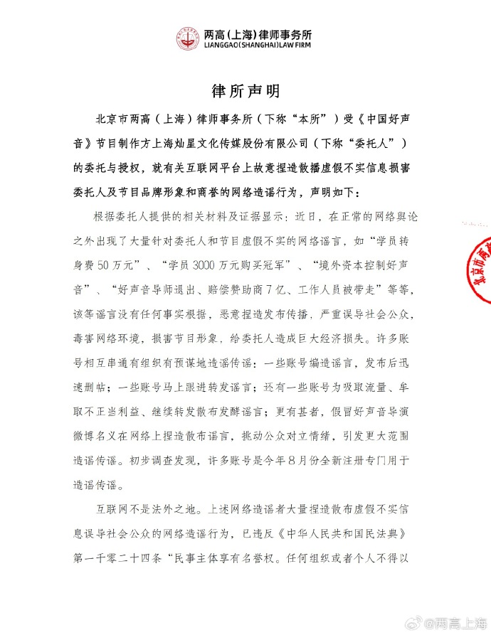 新京报讯 据两高上海律师事务所官方微博消息,北京市两高(上海)律师事务所受《中国好声音》节目制作方上海灿星文化传媒股份有限公司的委托与授权,就有关互联网平台上故意捏造散播虚假不实信息损害委托人及节目品牌形象和商誉的网络造谣行为,声明如下: