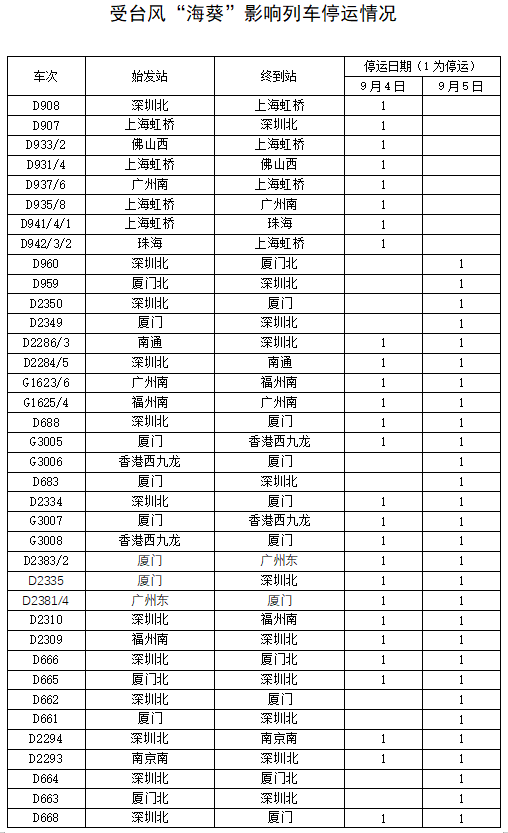 受台风“海葵”影响 铁路部门停运途经杭深铁路部分旅客列车