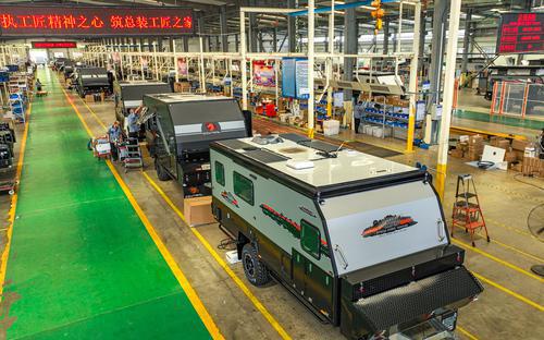 ▲8月24日,山东省荣成市一家房车制造企业的工人在生产线上忙碌(无人机照片)。图/新华社
