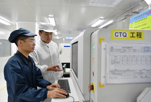 ▲8月15日,在位于福州市马尾区的飞毛腿电池有限公司电池SMT贴片生产车间,工人操作自动机械设备进行手机电池的贴片组装。图/新华社