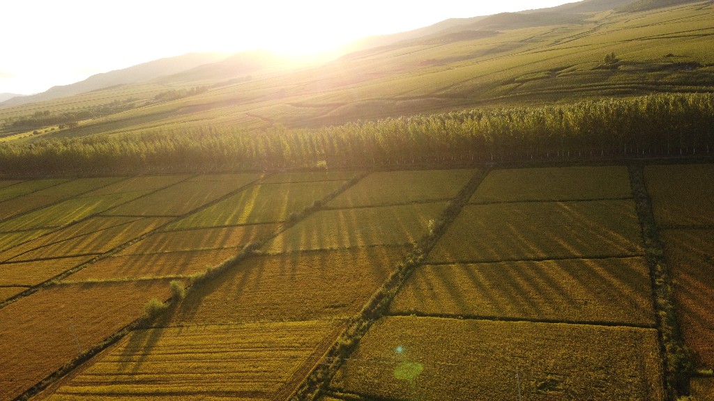 黑龙江宝清县夹信子镇,即将成熟的水稻在夕阳下泛出金光。