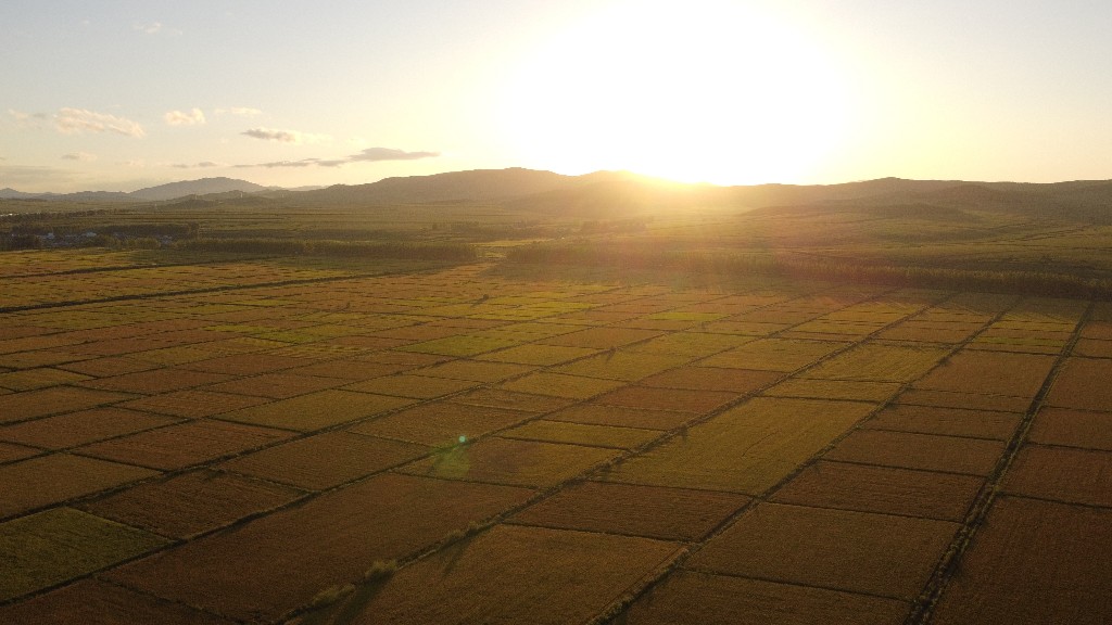 黑龙江宝清县 万亩稻田夕阳下泛出金光