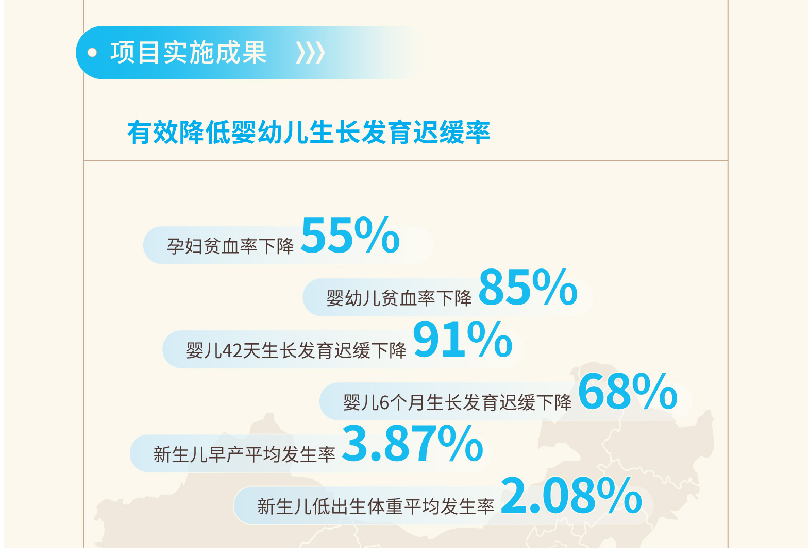 报告数据显示,调研区域内的孕妇贫血率下降55%,婴幼儿贫血率下降85%,婴儿42天生长发育迟缓率下降91%。从孕早期开始提供营养支持及健康指导对显著改善母婴营养状况、降低出生缺陷非常重要,因此提前生长发育干预窗口至孕期对生命早期健康有重要意义。