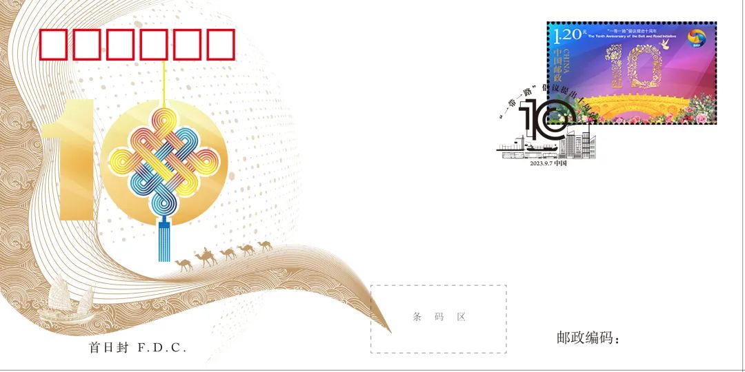 《“一带一路”倡议提出十周年》首日封以中国结代表“一带一路”的互联互通理念。数字“10”寓意倡议提出十周年,背景的纹理代表“一带一路”涉及的海上与陆上国家。首日戳用“10”作为主题形象,城市剪影为辅助图形,构建“一带一路”畅享蓝图。