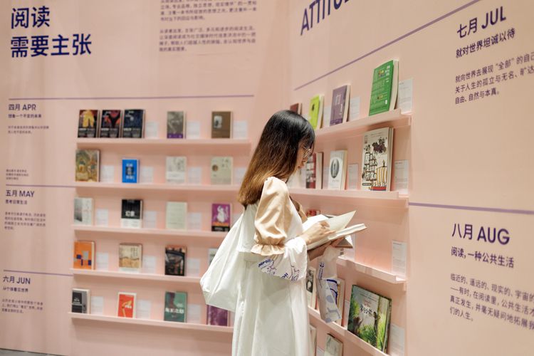 由理想国、三联学术、磨铁、商务印书馆、新星等15家出版社、图书品牌组织的15个室内主题特展不容错过。图为读者参观新书月榜展览。