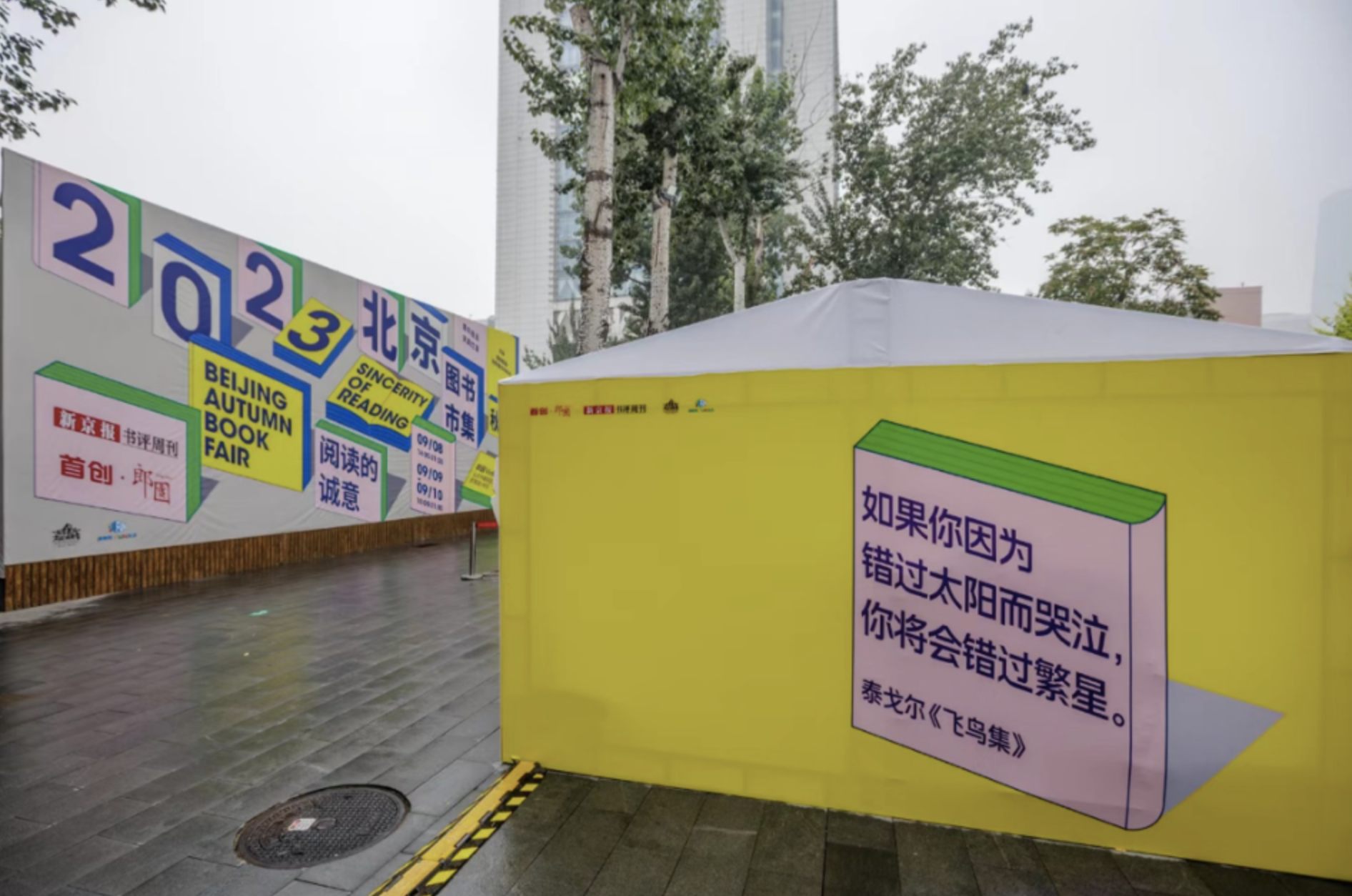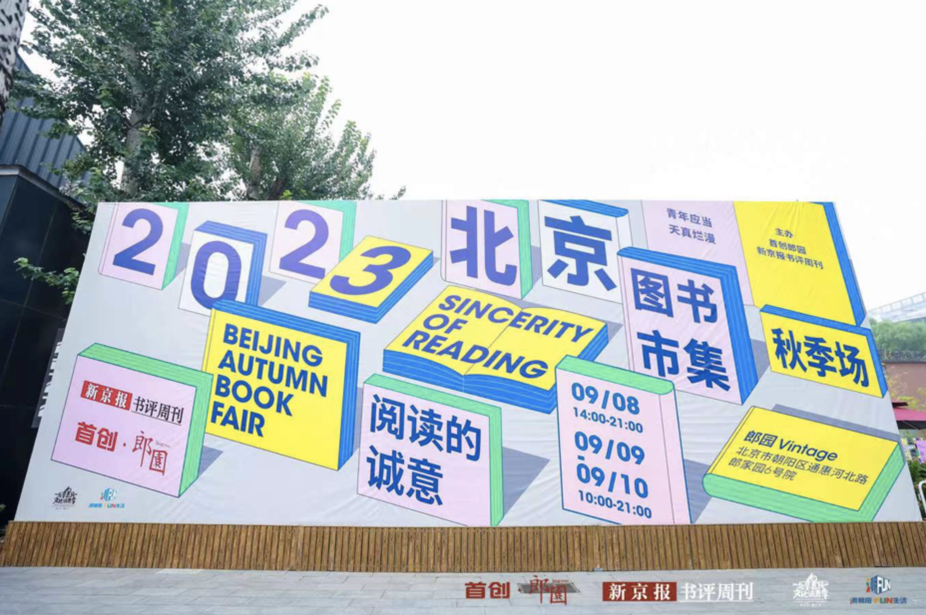 经历数月的前期准备后,书评君精选了147家出版摊位,并在室内筹划了15个主题特展。终于时间来到9月8日,我们在秋季再度相遇的那天。先来整体看看这届书市的布局,这里是入口处,标识醒目到隔着马路都看得见: