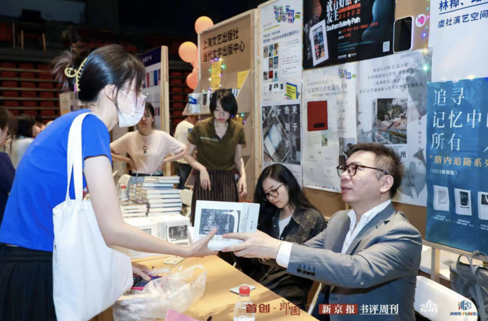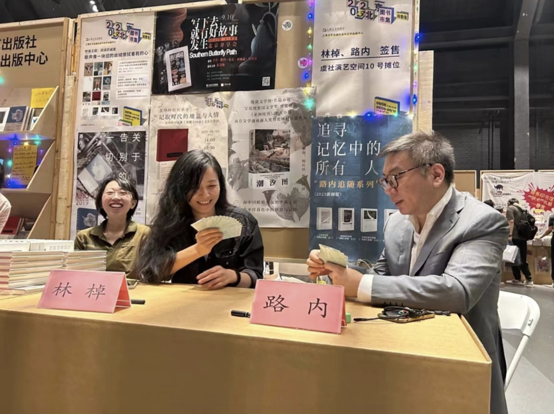 虽然室外下着大雨,让自己沉浸在室内书的世界中也别有一番滋味。走进摊位,也许你还会偶遇到坐摊签售的作家林棹和路内。他们既是书中隐藏在文字背后那个与你倾心交流的人,也是日常生活里那个唠嗑打牌的朋友。书市的魅力大概也在于,在这里你能把书籍带进生活,也能在书里再度发现生活。也许你想象中的场景是这样的: