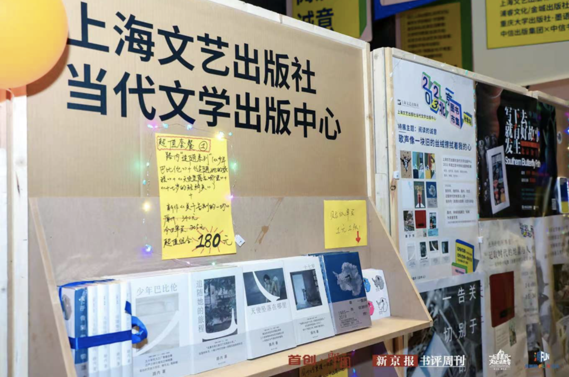 佳作书局聚焦艺术家,选取覆盖艺术家各类艺术表现形式的书籍,力图呈现艺术家们真实的创作历程。上海文艺出版社当代文学出版中心则以“歌声像一块旧的丝绒擦拭着我的心”为主题,展示了上海文艺出版社当代文学出版中心2021年成立至今的所有出版物,包括《收获长篇小说系列》、金宇澄《繁花》、程永新《穿旗袍的姨妈》、路内“追随系列”等。