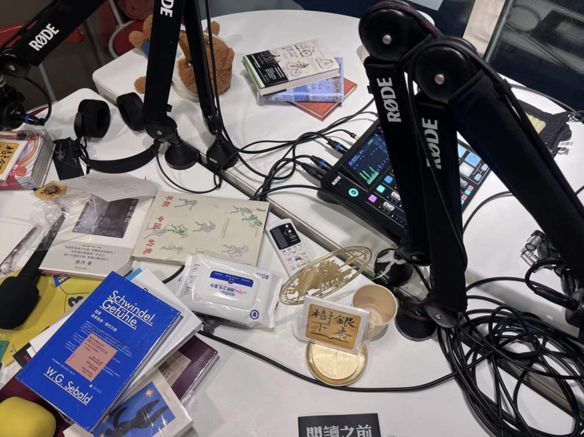 秋季书市,书评君还首次尝试播客串台活动,特邀6档播客节目:“即兴沉默”“文艺富薪”“最近买了什么书”“活字电波”“偶然误差FM”和“银杏树下”来到书市,从线下逛到线上,带不能来到现场的朋友们用“耳朵”逛书市。其中,“最近买了什么书”是一档泛文化类播客,两位主播野兔和山猪还是一对夫妻,他们已在图书行业从业8年,利用下班后的时间在桂林开了一家“野山书店”,现在这家书店已经变成了一家以播客为特色的书店,店内有多档读书类播客的灯牌,并经常组织线下的播客串台现场录制活动。