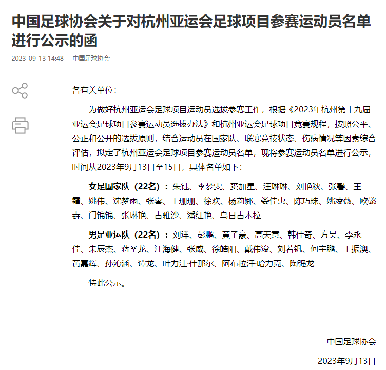 足协公示男女足亚运队名单,刘若钒顶替刘祝润