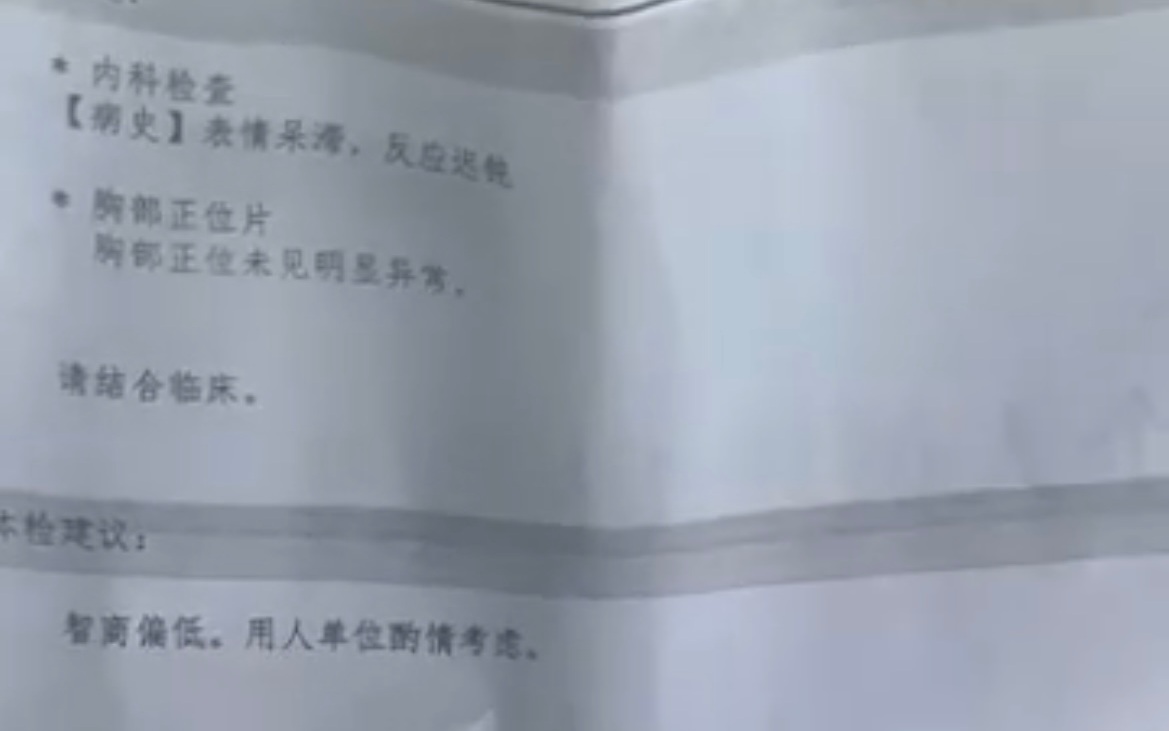 网传体检报告显示,“内科检查”一栏里写有“表情呆滞,反应迟钝”,体检建议一栏写有“智商偏低,用人单位酌情考虑”,体检结论为“合格”。