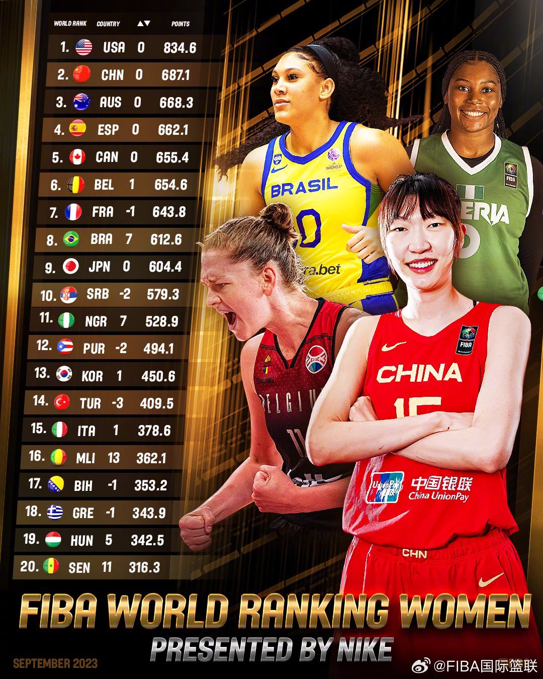 最新国际篮联女子世界排名公布:中国女篮保持世界第二,巴西女篮上升7位至第八名,塞尔维亚女篮下降2位至第十名,马里女篮上升13位至十六名。(@FIBA国际篮联)