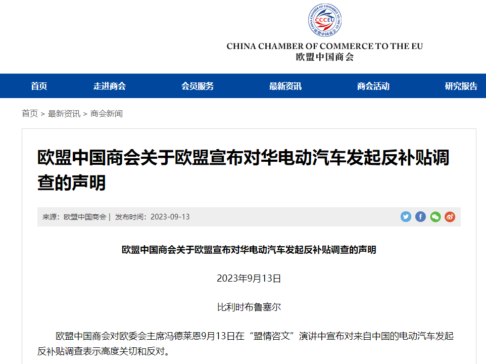 欧盟中国商会对欧委会主席冯德莱恩9月13日在“盟情咨文”演讲中宣布对来自中国的电动汽车发起反补贴调查表示高度关切和反对。