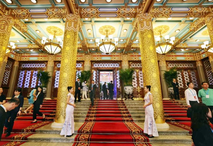 9月14日,北京饭店金色大厅,礼仪小姐迎宾。2023年北京文化论坛升格为国家级、国际性论坛,成为支撑首都“四个中心”功能建设的重要平台,也为我国面向世界开展文化交流、文明互鉴增添了一个新的重要窗口。